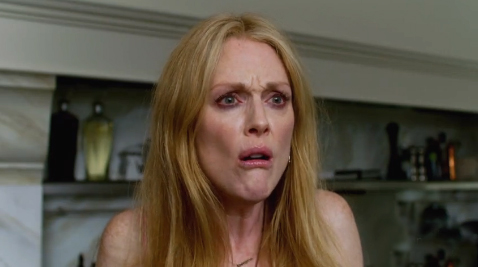 Cronenberg opens with the prototypical Hollywood Dream Scene: a willowy young thing arrives by bus in the City of Angels. This is Agatha Weiss (Mia Wasikowska of Tim Burton’s “Alice in Wonderland”). No naif, the fire-scarred Agatha is either already very well connected or certifiable. In no time, she makes friends with a handsome limo driver (“Twilight’s” Robert Pattinson) and becomes the personal assistant/”chore whore” of an aging, pill-popping, flatulence-obsessed actress named Havana Segrand (Moore). In desperate need of a comeback vehicle, Havana is in line to star in the indie “Stolen Waters.” Her agent ‒ and just about everyone else in town ‒ thinks it’s a bad idea. Havana, in the ultimate “stunt casting,” would play her own mother, who, before dying in a fire, starred in the original “Stolen Waters.” Havana is obsessed with the role, as much to prove her critics wrong as to purge memories of a possibly abusive parent.